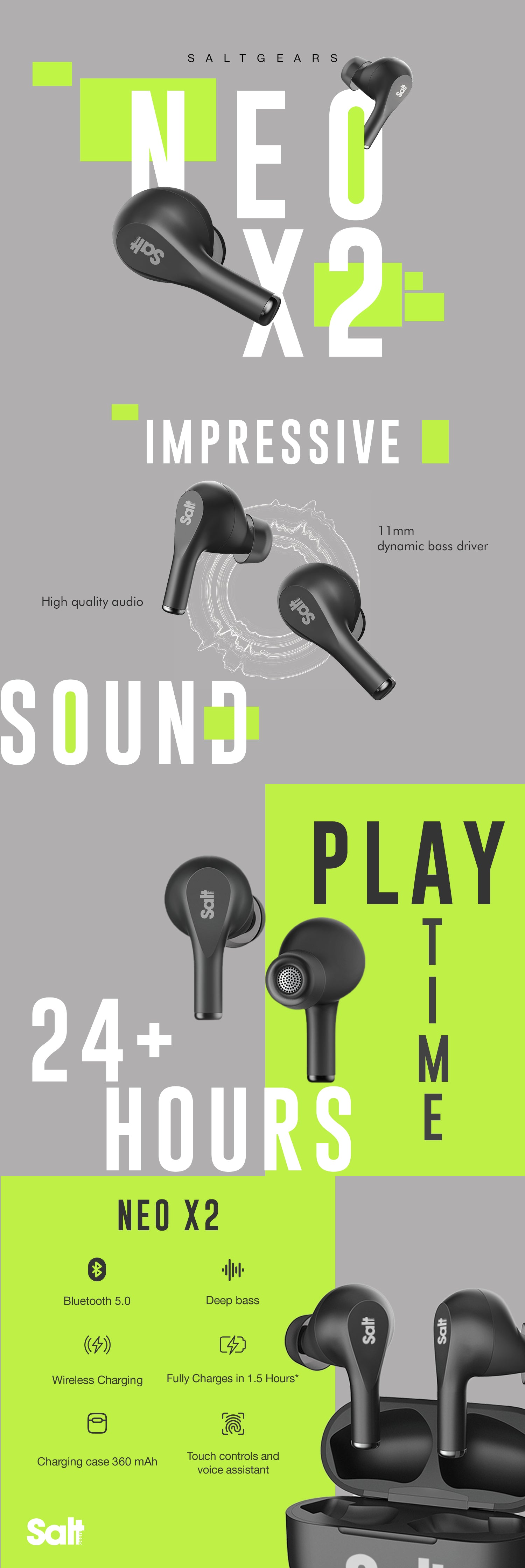 SaltGears Neo X2 True Wireless Earbuds with 11 mm Drivers, Mic, Low Latency, 3D Touch Control, Bluetooth 5.0, 360mAh Battery, ENC, 1.5 hours Charging Time, and Google Assistance.